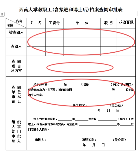 一、资料准备。各二级单位线下填写《西南大学教职工(含拟进和博士后)档案查阅审批表》(以下简称《审批表》),并提交所在单位负责领导签字并盖章。涉及多位“被查阅人”的,可以一并填写。