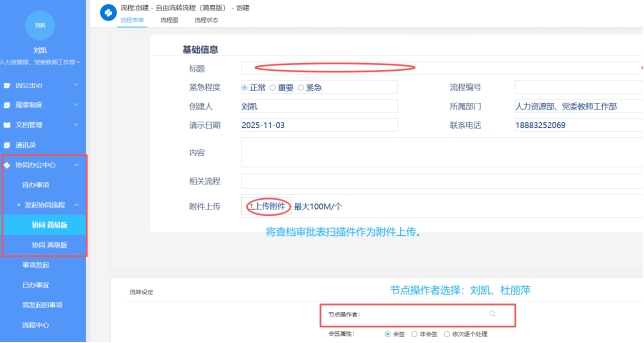 二、提交上传。各二级单位扫描该《审批表》,通过“办公系统”—左侧“协同办公中心”—“发起协同中心”—“协同 简易版”,填写相关基础信息,查档审批表扫描件作为附件上传。节点操作者同时选择:刘凯、杜丽萍。最后选择右上角“提交”即可。
