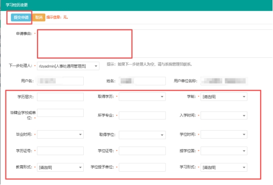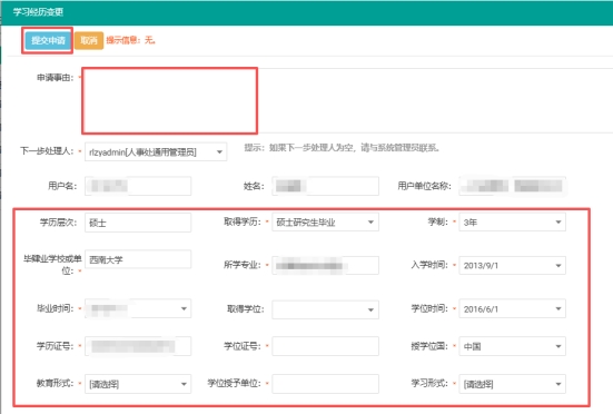 (5)填写完整的学习经历信息(如为下拉菜单请选到最后一级的内容),填写申请事由,点击“提交申请”,并提供相应证明材料给办公室主任。