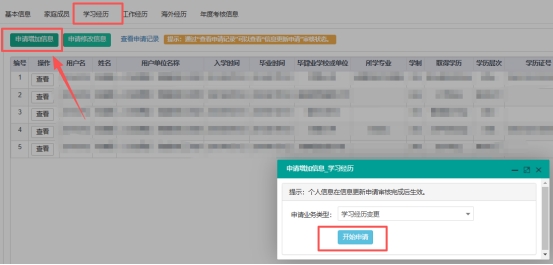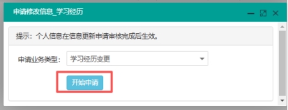 (1)如修改某一条学习经历,选择“学习经历”,点击“申请修改信息”,点击“开始申请”。