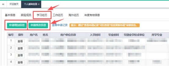 (4)如新增学习经历,请点击“申请增加信息”,点击“开始申请”。