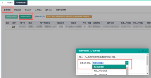 (1)选中“基本信息”,点击“申请修改信息”,选择“申请业务类型”