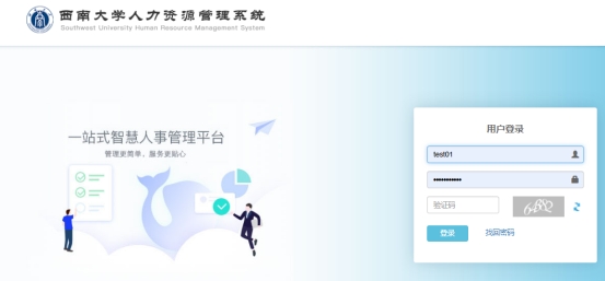 2.方式二:在校园网环境下,使用账号和密码登录网址https://rlzy.swu.edu.cn。账号:工号,初始密码:“rlzy@”+“身份证(或护照)后6位”(例如:“rlzy@12345X”),如忘记密码建议通过方式一登录,也可联系人力部信息科查询密码。