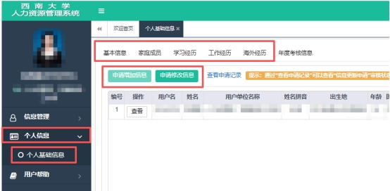 1.点击左侧“个人信息”按钮,点击“个人基础信息”进入数据展示页面。