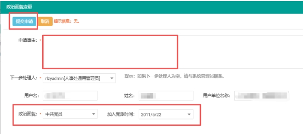 (3)修改可读写的字段为正确信息(如为下拉菜单请选到最后一级的内容),填写申请事由,点击“提交申请”,并提供相应证明材料给办公室主任。