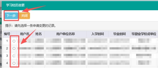 (2)选中要修改的某一条学习经历,点击“下一步”。